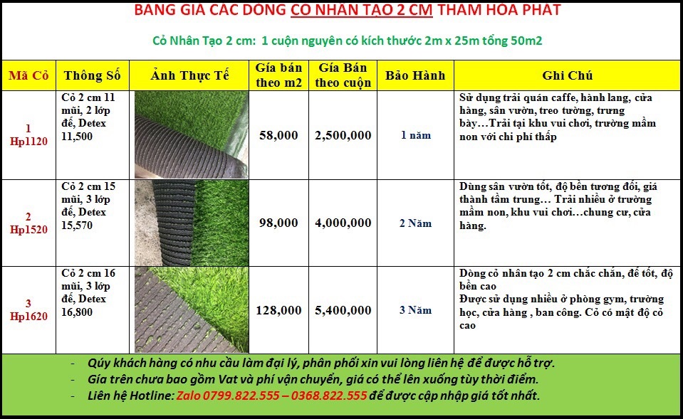 Ghi chú rõ dàng cùng dòng 3 cm nhưng có giá thành khác nhau. Do phụ thuộc vào số lượng mũi khâu, số lớp đế, mật độ cỏ trên mỗi m2