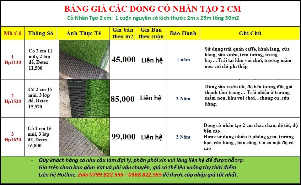 ? Giá trên là các dòng Cỏ Nhân Tạo phổ thông và mang tính chất tham khảo, có thể thấp hơn hoặc cao hơn tùy thời điểm. Do đó quý khách vui lòng liên hệ Hotline 0799.822.555 để được báo giá tốt nhất.